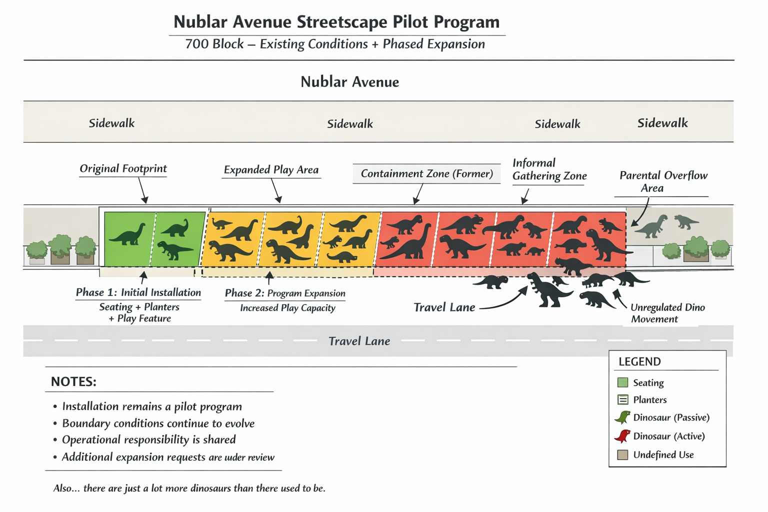 “Look, we love the dinosaurs,” said Ian Malcolm, who runs a barber shop across the street. “But the loss of parking on a commercial corridor like this—it’s significant.”